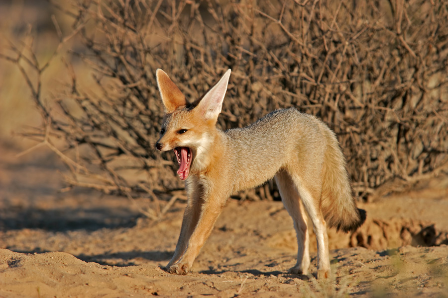 The cape fox is a small specie of fox, native to southern Africa. It is also calle a South African version of a fennec fox due to its similarly big ears. It is the only "true Fox" occurring in sub-Saharan Africa, and it retains primitive characteristics of Vulpes because it diverged early in the evolutionary history of the group. The Cape Fox preys on insects, mice and other small animals. They occasionally ingest wild fruit and carrion in farming areas.